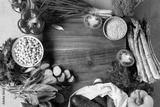 Overhead view of clean food and kitchen board