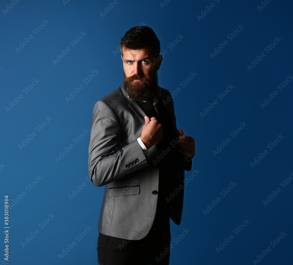 Male in suit, man in tuxedo, stylish man in a cloth jacket. Handsome bearded businessman in classic suit. Businessman in vest. Elegant guy, classic tuxedo and jackets. Sexy male, brutal macho, hipster