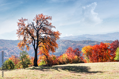 Majestic tree with orange leaves at autumn mountain valley. Dramatic colorful scene. Carpathian mountains, Ukraine. Landscape photography