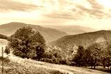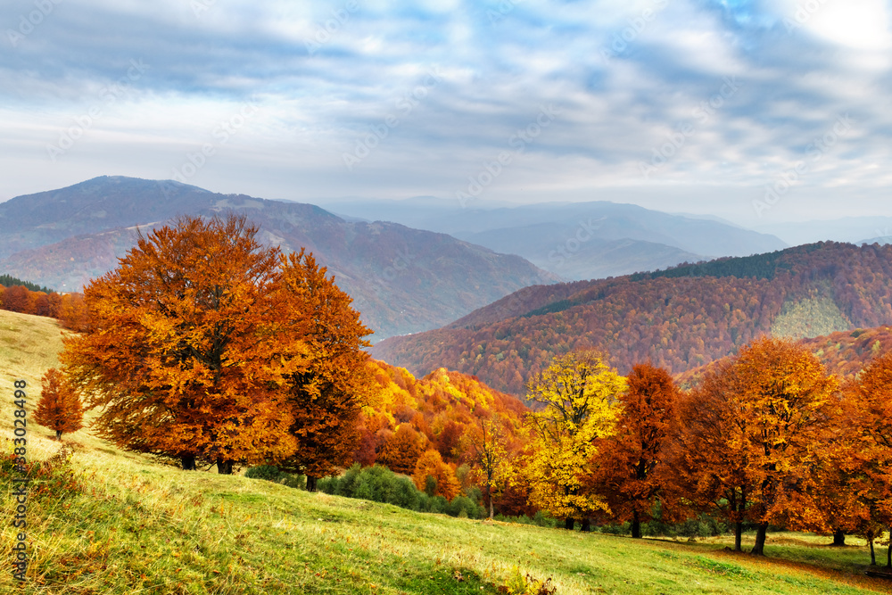 Panorama of picturesque autumn mountains with red beech forest in the foreground. Landscape photography
