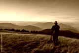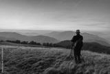 Photographer taking photo with tripod of autumn landscape with foggy peaks and orange trees. Ukrainian Carpathians mountains