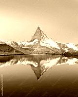 Picturesque landscape with colorful sunrise on Stellisee lake. Snowy Matterhorn Cervino peak with reflection in clear water. Zermatt, Swiss Alps