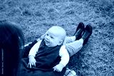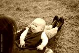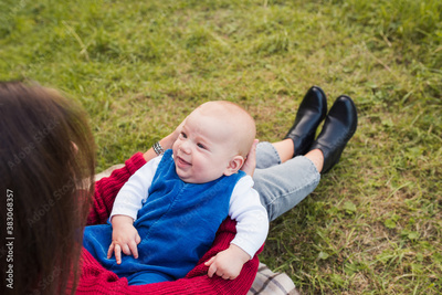 Cute baby in loving mother's hands, outdoor lifestyle portrait