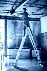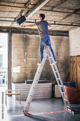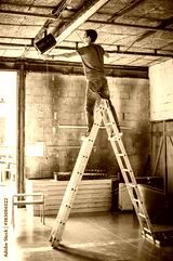 Behind the scene Lighting technician electric engineer adjusting stage lights. Spotlights in the theater