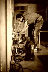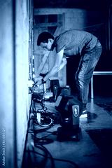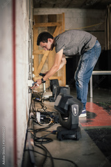 Theater lighting technician electric engineer adjusting focus of lighting elements backstage. Spotlights in the theater. Behind the scene