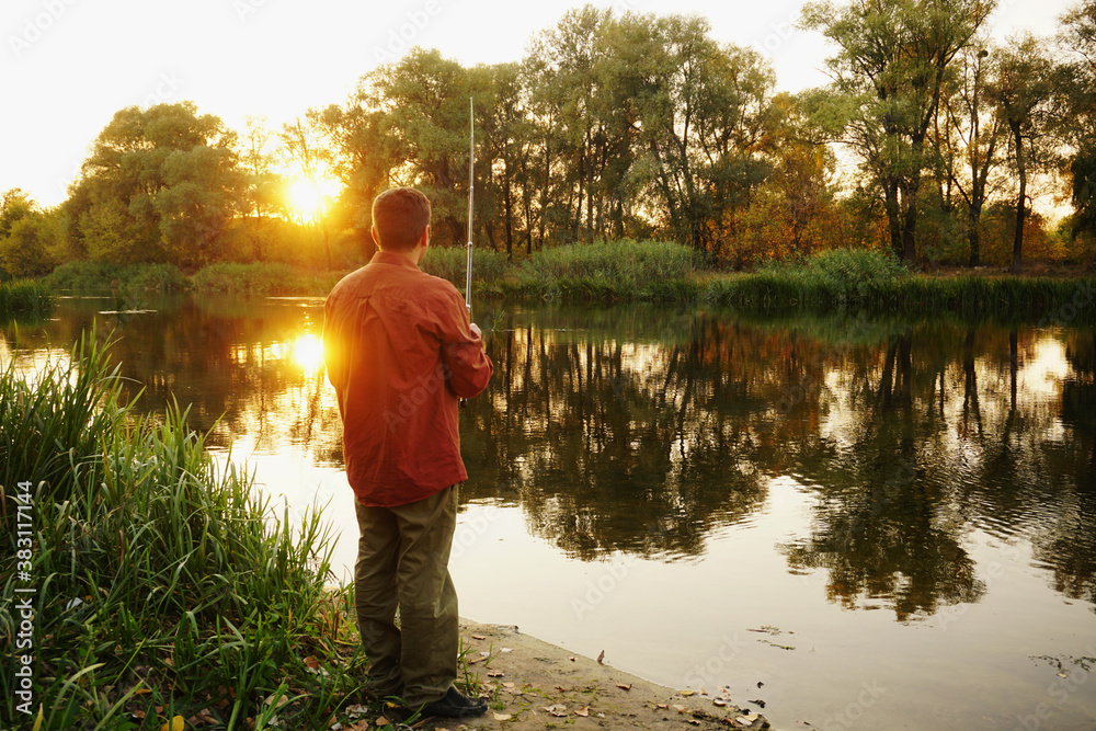 Fisherman fishing on the river bank with colorful sunset