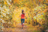 Outdoor sports active lifestyle runner running in forest woods foliage with autumn yellow leaves. Woman jogging away view from behind.