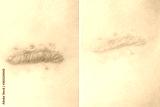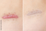 Close up of cyanotic keloid scar caused by surgery and suturing, skin imperfections or defects before and after treatment and laser removal. Hypertrophic Scar on skin, dermatology and cosmetology