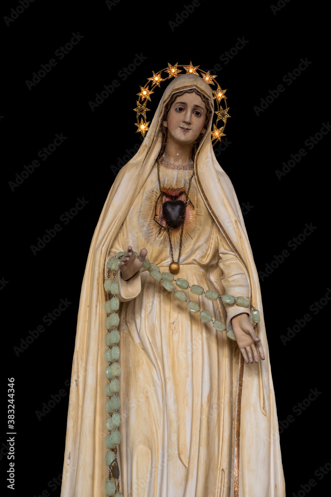 Well, Netherlands - September 30, 2020: Beautiful painted Virgin Mary statue from a catholic chapel isolated on black background