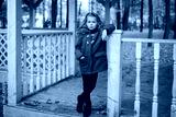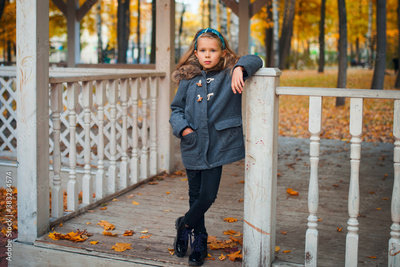 Fashion 8 y.o. girl posing on empty wooden terrace in autumn park