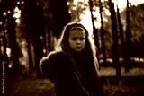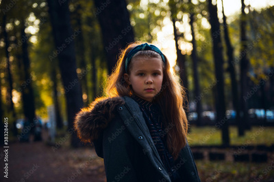 Outdoor portrait of cute fashion girl at autumn park on sunset