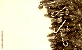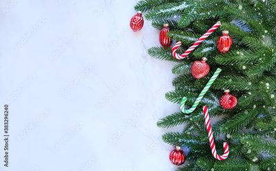 Christmas tree, candy canes, toy decor on marble background. Christmas and New Year holiday background. winter season. copy space