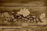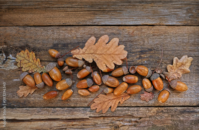 old wooden background with acorns and oak leaves. autumn time concept. fall harvest season.