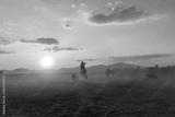 Wild horses run in foggy at sunset. Between Cappadocia and Kayseri, Turkey