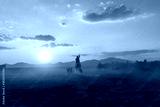 Wild horses run in foggy at sunset. Between Cappadocia and Kayseri, Turkey
