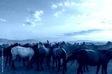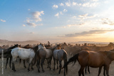 Wild horses run in foggy at sunset. Between Cappadocia and Kayseri, Turkey