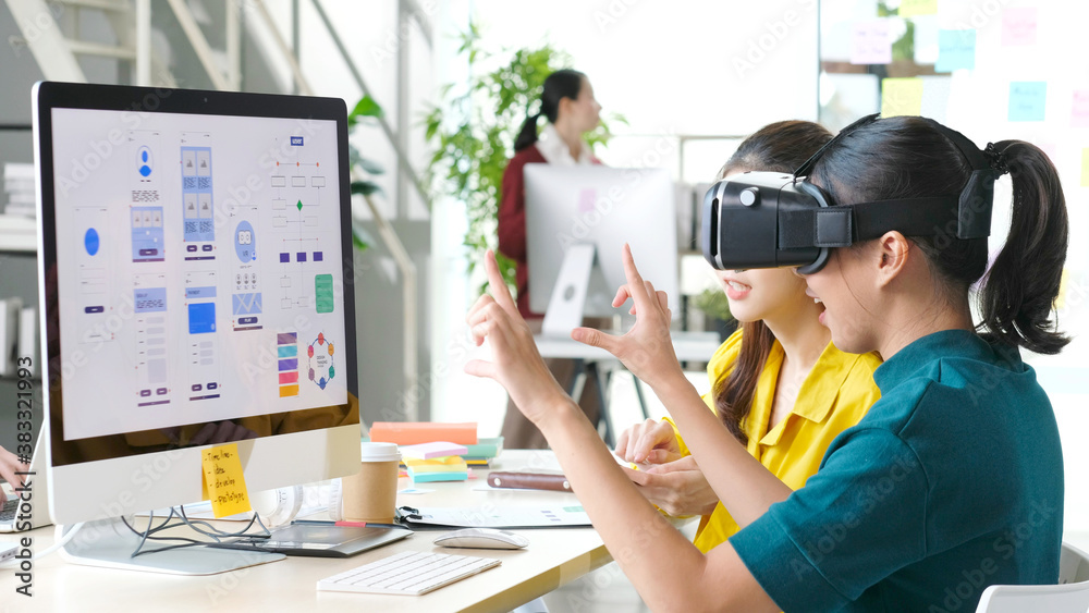 VR mobile phone application test, Asian woman with virtual reality glasses headset in VR experience, Asia business team developers for reality simulator smartphone app test at creative office, ui