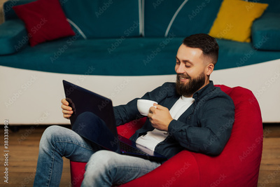 Cheerful freelancer guy drinking coffee and using laptop during work at home. Remote work. Handsome man working at home.