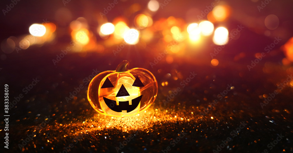 Neon glowing pumpkin head on abstract blurred bokeh background. Halloween festive background