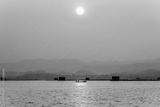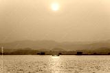 Beautiful nature landscape silhouette fisherman driving a boat to home under the sun, Golden light on the red orange sky at sunset local fishing rural lifestyle at Krasiao Dam, Suphan Buri, Thailand
