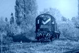 Old colorful blue railway locomotive on track tracks and beautiful yellow autumn forest. A train moving on railway tracks.
