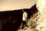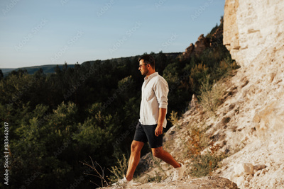 Man traveling in mountains. Young bearded man in sunglasses walks on the rocky mountain. Active healthy lifestyle.