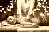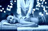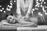 wellness, beauty and relaxation concept - beautiful young woman lying and having back massage at spa over festive lights on background
