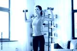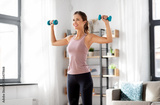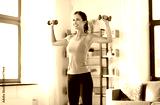 fitness, sport and healthy lifestyle concept - smiling young woman with dumbbells exercising at home