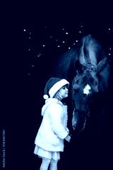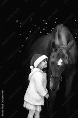 Little beautiful girl posing in christmas outfit next to a big red horse