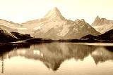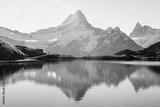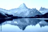 Bachalpsee lake in Swiss Alps mountains. Snowy peaks of Wetterhorn, Mittelhorn and Rosenhorn on background. Grindelwald valley, Switzerland. Landscape photography