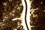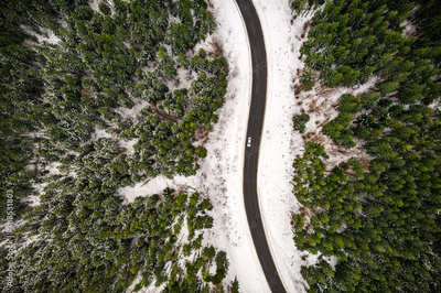 Flight over the winter mountains with road serpentine and snowy forest. Top down view. Landscape photography