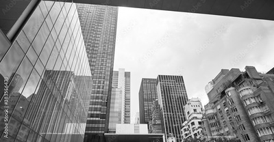 Black and white picture of New York City diverse architecture on a cloudy day, USA.