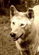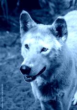 White gray wolf looking off camera left