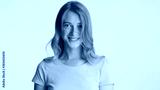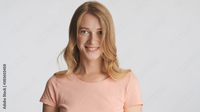 Beautiful smiling girl happily looking in camera over white back