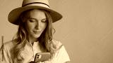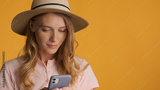 Portrait of girl in hat intently chatting online with friends on