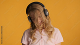 Beautiful girl dreamily listening new song in headphones isolate