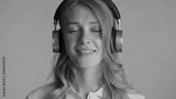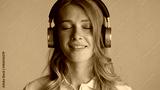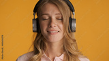 Beautiful dreamy girl listening music in headphones with eyes cl