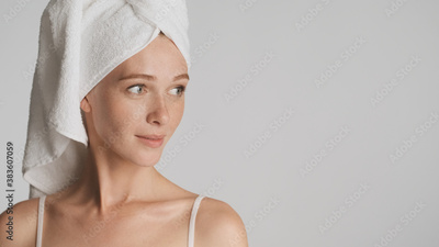 Beautiful girl with smooth skin wearing towel on head intently l