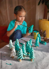 DIY craft gifts and Christmas decoration. Girl coloring cone as if it is pine tree, be green