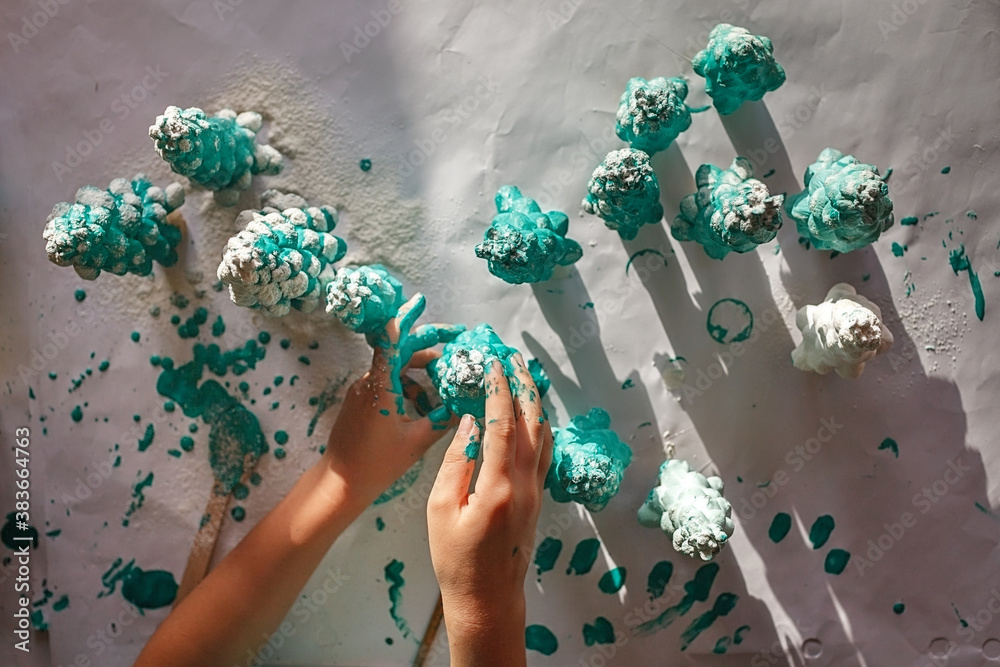 DIY craft gifts and Christmas decoration. Girl coloring cone as if it is pine tree, be green