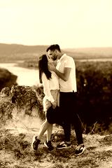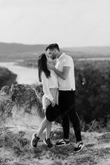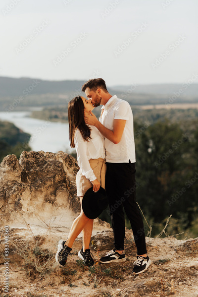Stylish couple in love in walk on a picturesque hill hug and kiss. Scenic mountain and river view.