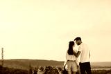 Couple enjoying mountain scenery. Loving couple are hugging on the mountain outdoors. Man and woman travel together. Couple traveler enjoys nature. Copy space.