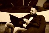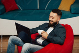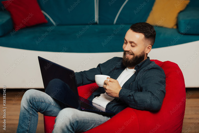 Bearded businessman working on his laptop at home and take coffee break. Happy man sitting on red armchair with laptop computer and drinking coffee in a living room.