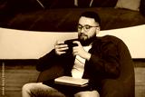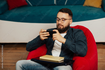 Bearded man in eyeglasses sit on the red armchair and relax at home while using modern cell phone after work at notebook.