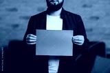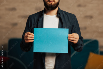Bearded man holds in front of him a blue mockup. A young, attractive man holding a blank blue A4 sheet. Mockup, layout, copy space.