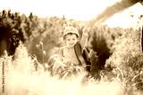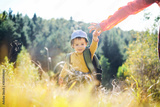 Small kid in yellow sweater walking with mother in autumn forest. Childhood with nature loving concept