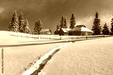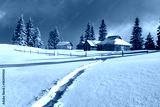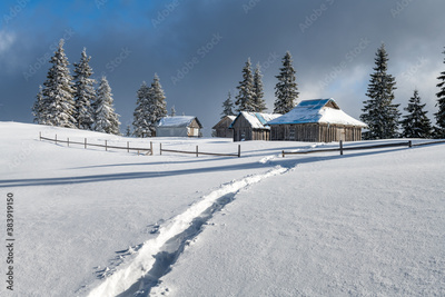 Fantastic winter landscape with wooden house in snowy mountains. Christmas holiday concept