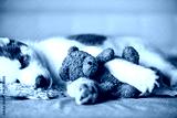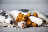 A small white dog puppy breed siberian husky with beautiful blue eyes lays on grey carpet with bear toy. Dogs and pet photography