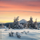 Fantastic orange winter landscape in snowy mountains glowing by sunlight. Dramatic wintry scene with snowy trees. Christmas holiday background