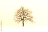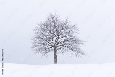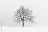 Minimalistic landscape with a lonely naked snowy tree in a winter field. Amazing scene in cloudy and foggy weather. Christmas and winter holidays background